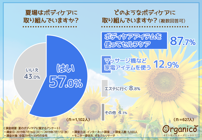 続いて、「夏場はボディケアに取り組んでいますか?」という質問をしたところ、6割近くの方が『はい』と回答し、内容について詳しく聞いてみると、9割近くの方が『ボディケアアイテムを使ってセルフケア』に取り組んでいることが分かりました。