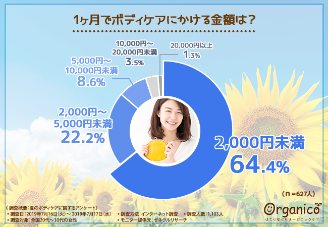 また、1ヶ月に使うボディケア代について聞いてみると、『2,000円未満(64.4%)』と回答した女性の割合が最も多く、次いで『2,000円~5,000円未満(22.2%)』『5,000円~10,000円未満(8.6%)』と続きました。