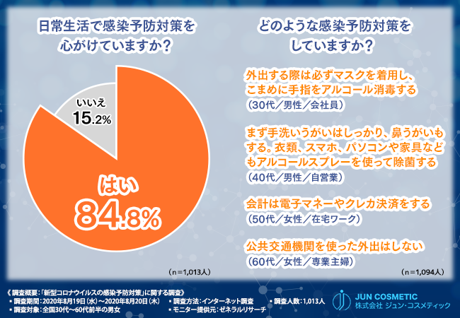 新型コロナウイルスによる生活の変化について明らかになり、日常生活で感染予防対策を心がけている方は8割に上り、多くの方が意識的に対策を行っていることが分かりました。