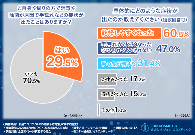 そこで、「ご自身や周りの方で消毒や除菌が原因で手荒れなどの症状が出たことはありますか?」と質問したところ、3割近くの方が『はい(29.5%)』と回答しました。