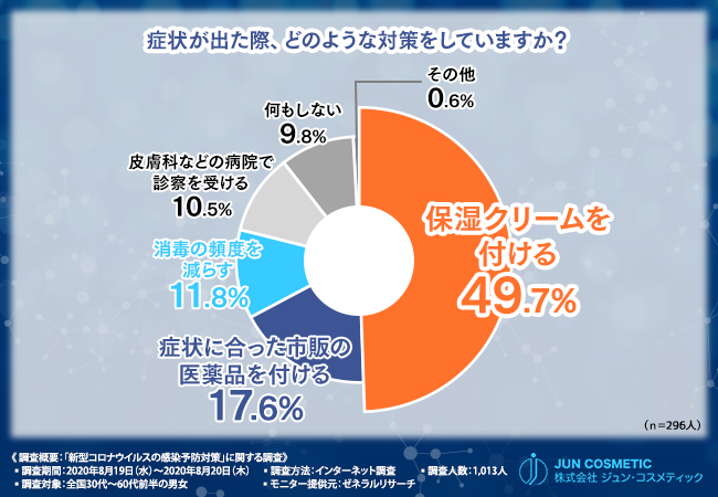 「症状が出た際、どのような対策をしていますか?」と質問したところ、『保湿クリームを付ける(49.7%)』という回答が最も多く、次いで『症状に合った市販の医薬品を付ける(17.6%)』『消毒の頻度を減らす(11.8%)』『皮膚科などの病院で診察を受ける(10.5%)』と続きました。
