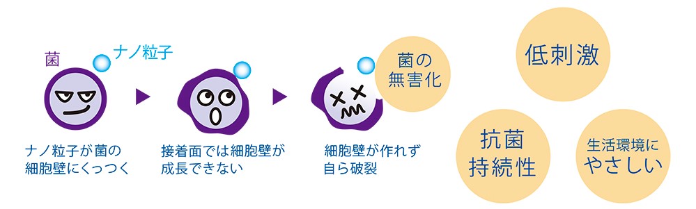 菌に吸着して自己融解に導き、菌の生育・増殖を抑える働きのあるナノサイズの微粒子で、菌のみに効果を発揮 し、洗浄してもお肌に留まりやすく、長時間効果が持続します。